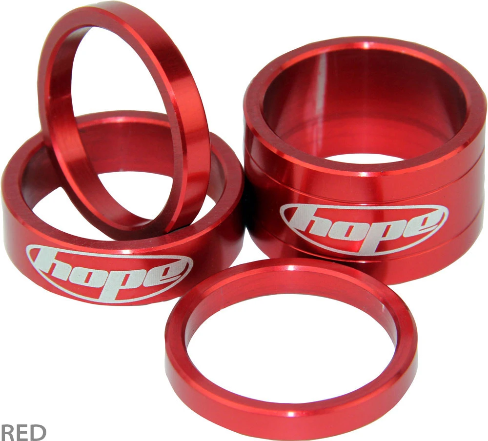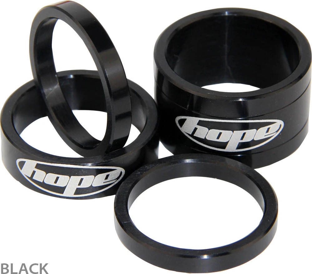 Le set d’entretoises ultraléger « Space Doctor » de Hope, fabriqué en aluminium et portant le logo Hope gravé au laser, comprend trois tailles différentes pour un réglage individuel de la hauteur.